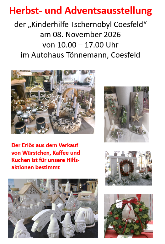 Herbstausstellung der Kinderhilfe Tschernobyl Coesfeld im Autohaus Tönnemann, Dreischkamp Coesfeld Über Hilfe in der Cafeteria und beim Grillstand würden wir uns freuen. Unseren Flyer finden Sie hier |